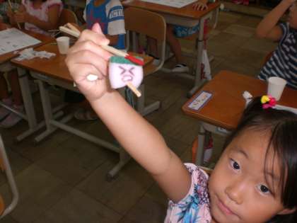 ティッシュをはしでやぶる練習をしたり,顔の描いてある小さなスポンジをはしではさみ,泣き顔にする練習をしたりと,楽しく学習をすることができました。