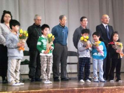 3月1日の朝会で,いつも子ども達の安全な登下校を見守ってくださっていた地域の「あいさつ運動」「見守り隊」の皆さんにお礼の気持ちをこめて,感謝状と花束を渡しました。「いつも私たちの安全を見守ってくださってありがとうございました。」児童の代表から,御礼も伝えました。