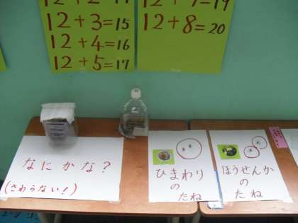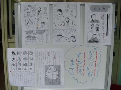1年生の教室の隣の学習室の前には,算数や国語,生活科に関係した「学習コーナー」が作られています。休み時間などに子ども達が様々な問題にチャレンジしています。