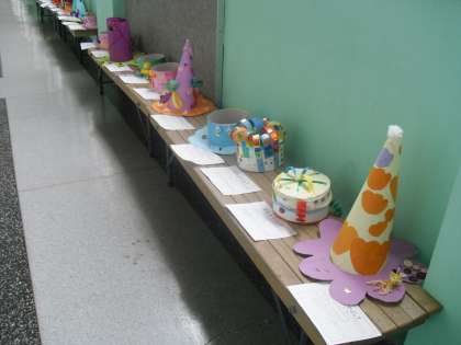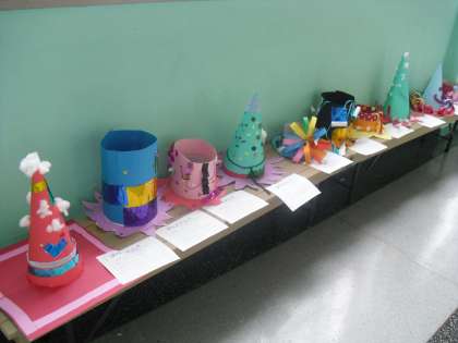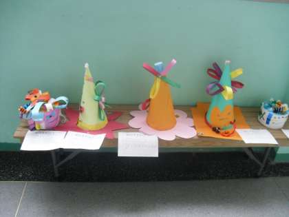 図工の時間に作った「ぼうしをかぶって」の作品が2年生の教室前の廊下に展示されています。いろいろな形や模様の楽しいぼうしがありますね。