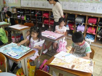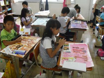 2年生は図工の時間に「お話しの絵」を書いています。お話を読んで,好きな場面を思い浮かべて,その場面に合う描画材を選んで絵に表します。みんな丁寧に作品を作っていました。