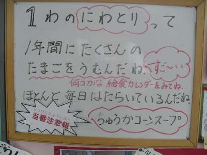 にわとりが産むたまごの数はいくつか知っていますか?1羽のにわとりがうむたまごの数は,1日に1個と言われています。1年間では,約300個ぐらいうむそうです。たまごは,血や筋肉など,体を作る栄養が多くふくまれています。