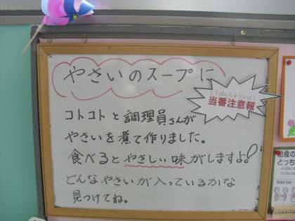 今日の野菜スープに「キャベツ」が入っています。キャベツはレタスに似ていますが同じ仲間ではありません。キャベツは大根の次に多くとれる野菜です。キャベツには胃を丈夫にする栄養があります。