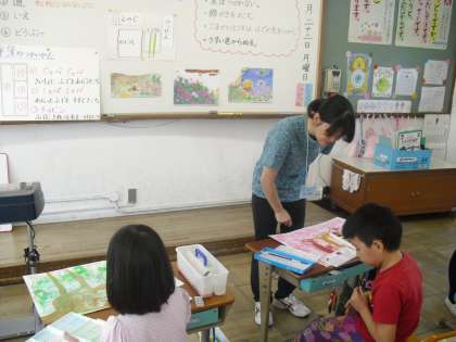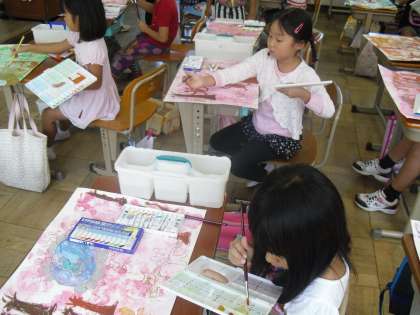 今日の図工の時間は,絵の具とクレパスを混ぜて描きました。特に,絵の具では用具の置き方や筆洗の使い方を教えてもらいました。