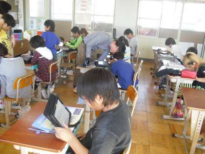 4年生は「月の動き」の学習をしています。今日は1組でタブレットを使って,月の動きについて調べました。調べたことをカードにたくさん書いていました。みんなタブレットの扱いにもすっかりと慣れて,上手に調べていました。
