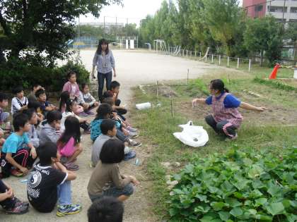 2年生は,生活科で「できたよ みんなの やさい」の学習をしています。今日は花壇に行って育てていたサツマイモを収穫しました。