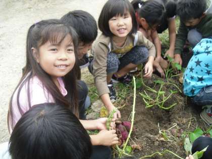 その後,みんなで芋掘りをしました。大きないもがたくさんとれて大喜びでした。いもはしばらく置いて,「サツマイモのパイ」を作る予定です。