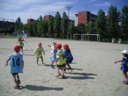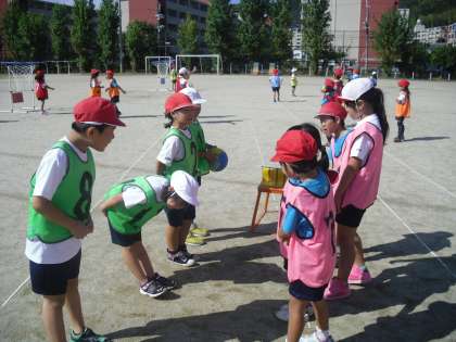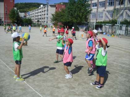2年生は体育で「パスゲーム」の学習をしています。ゲームのやり方にも,ルールにも慣れて,約束を守りながら自分たちでゲームを進めていました。