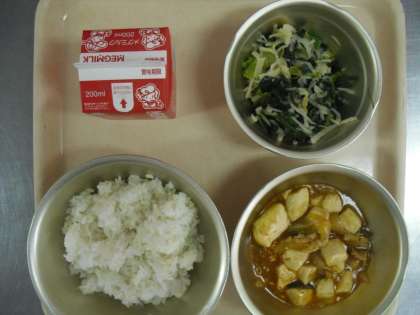 今日の給食は,「豆腐の四川風」「切り干し大根の炒めナムル」「麦ご飯」「牛乳」でした。