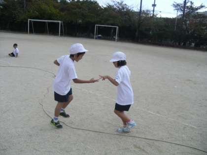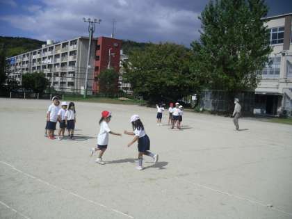 1年生は体育の時間に「どんじゃんけん」をしました。ケンケン跳びで「どんじゃんけん」をしたり,曲がったコースで「どんじゃんけん」をしたりして,仲良く楽しんで学習をしました。