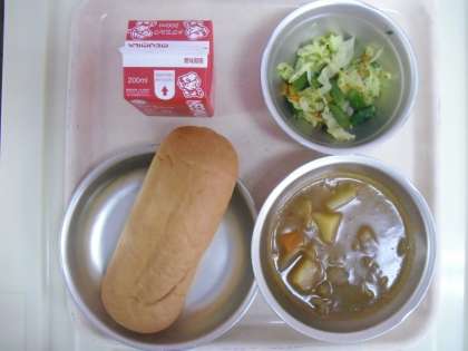 今日の給食は,「チキンカレーシチュー」「アスパラガスのソテー」「味付けコッペパン」「牛乳」でした。