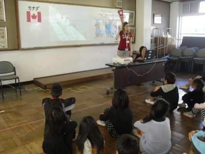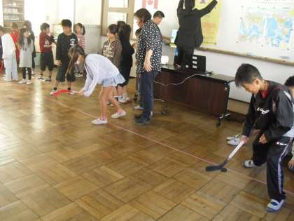 「カナダ」のコーナーでは,映像でカナダのことを教えてもらった後,カナダの国技であるアイスホッケーを体験しました。
