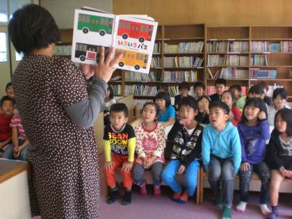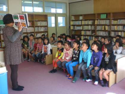 図書支援員の細谷先生が,絵本の読み聞かせをしてくださいました。お話の世界に入りこみ,とても熱心に聞き入っている子どもたちでした。1年生の子どもたちは絵本が大好きです。