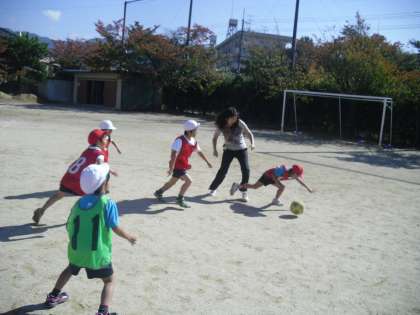 2年生は体育で「ボールけりゲーム」をしています。ゲームのやり方にも慣れて,元気いっぱいボールを蹴っていました。
