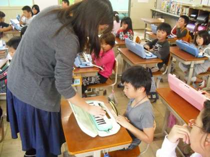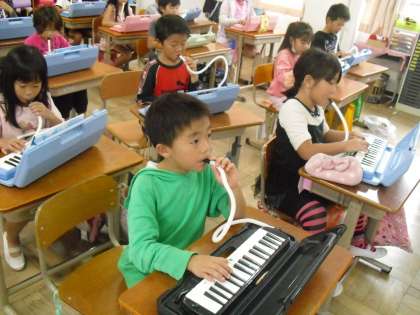 2年生は音楽発表会で行う「てぶくろ」の中で演奏する曲を鍵盤ハーモニカで練習しました。半音上がる音も出てくるのでシールで印をつけてもらいました。難しい所もみんなとても上手に演奏していました。