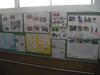 南校舎の踊り場にあるあゆみ学級の掲示板に,「修学旅行」「スチューデントシティ」「図工の作品」が展示されています。子ども達ががんばって取り組んだ様子が伝わってきます。