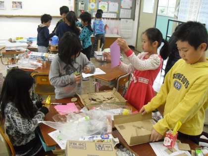2年生は生活科で「あそんでためしてくふうして」の学習をしています。いろいろな物の特長を生かしたり工夫したりして遊び道具を作って遊びます。