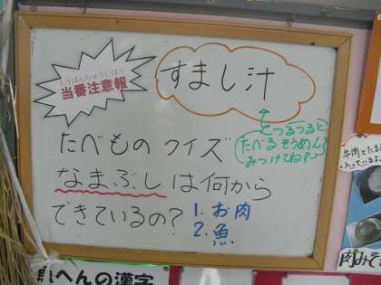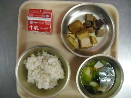 今日の給食は,「すましじる」「なまぶしと厚揚げの煮つけ」「むぎごはん」「「牛乳」でした。