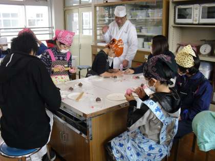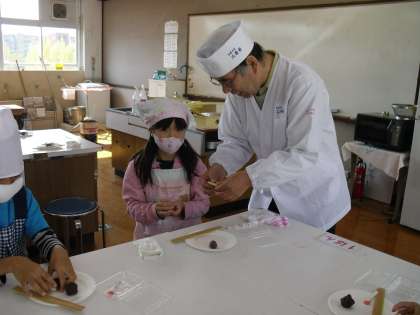 1 5年生は11月19日に匠に来ていただいて和菓子のねりきりを教えていただきました。おぐりすの名前に合わせて「くり」と「なでしこ」の花を教えてもらって作りました。優しく丁寧に教えていただいて,初めての体験ながらとても上手に作ることができました。
