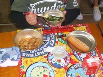 給食の第1日目はスパゲティです。子ども達の大好きなメニューです。副菜はホウレン草のソティです。デザートにはりんごゼリーがつきました。みんなしっかり,よく噛んで食べていました。第1日目は花丸でした。