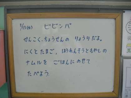 今日の給食は,「ビビンバのぐ」「ごはん」「わかめスープ」「牛乳」でした。ビビンバは,韓国・朝鮮のまぜごはんです。子ども達には大人気で「おいしいおいしい」と言って食べていました。ごはんに肉やたまご・ナムルなどの具を混ぜておいしくいただいていました。