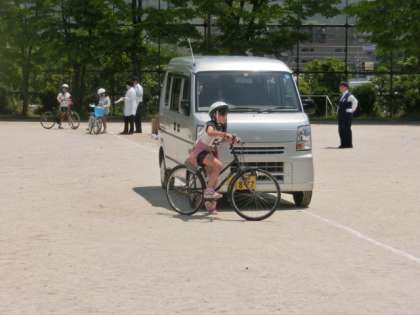 まず,自転車の技能を高め,安全に自転車に乗るために運動場に設置された様々なコースで練習しました。子どもたちは,1つ1つのコースを慎重に運転していました。