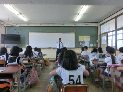 次に,教室で色々な標識の意味や注意することを学習しました。実際に警察官の方々から注意することを丁寧に教えていただきました。