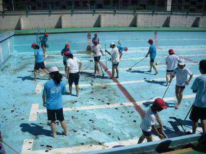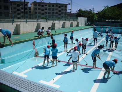 放課後は,教職員でプールサイドの清掃など仕上げを行います。高学年のお陰で10日からきれいなプールで水泳学習が始められます。