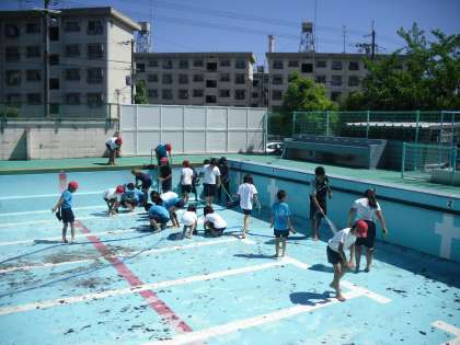 6月10日より低水位での低学年の水泳学習が始まります。今日は,水泳学習に向けてプール清掃を行いました。