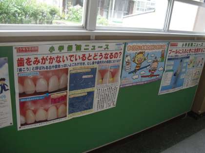 6月8日(月)から12日(金)まで,歯と口の衛生週間です。食後のうがいや歯みがきでむし歯を防ごうと,給食後の歯みがき指導や毎週水曜日のフッ化物洗口を行っています。歯みがきの仕方やおやつのとり方に気をつけて丈夫な歯を保てるように気をつけていきたいものです。保健室前廊下には,歯の予防やみがきかたなどのポスターを掲示しています。歯の健康をしっかりまもりましょう。