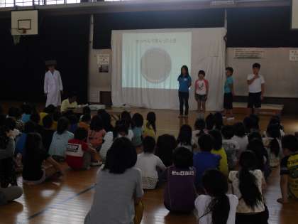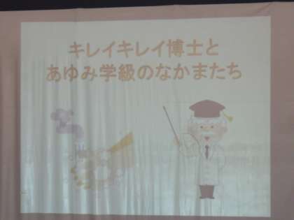 今日は生活向上の発表会であゆみのみんなで「キレイキレイ博士とあゆみ学級のなかまたち」という発表をしました。全校のみんなに,きれいな手の洗い方やお風呂での頭や体の洗い方について発表しました。キレイキレイ博士から手の洗い方を丁寧に説明もらい,みんなで,「全校のみんなもきれいに洗ってね」と働きかけてくれました。