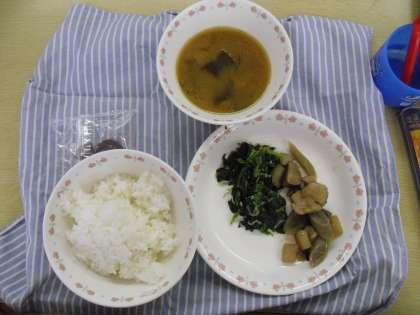 今日の献立は,ごはん・みそしる・にしめ(ほうれんそう・じゃこのいためもの)・ぶどうでした。