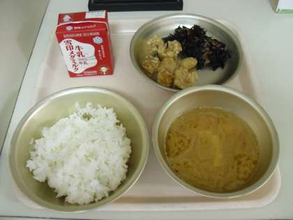 今日の給食は,ごはん・牛乳・たらのこはくあげ・ひじきとれんこんのいため煮・打ち豆汁でした。