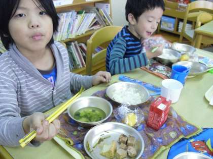 柿は日本で古来から食べられてきた果物です。ビタミンCが多く,体の調子を良くします。苦手な子もいるのですが,ランチルームの1年生も苦手だけどがんばるよ。と言って食べていました。生節もご飯と一緒に食べると食べやすく,だし汁や調味料のあまからい味を味わっていました。