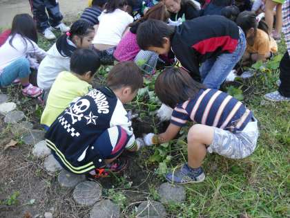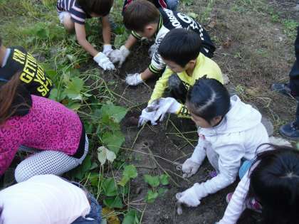 1年生の畑で自分たちが育てたおいもを掘りました。