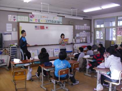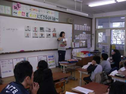 今日は,6年生に小栗栖中学校の英語科の先生が教えに来ていただきました。