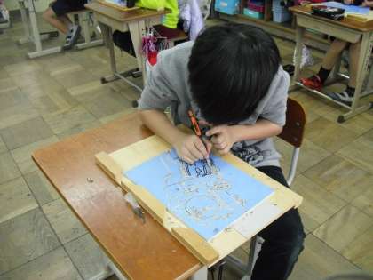 版画に取り組んでいる4年生です。とても丁寧で無言になって版画板に集中しています。