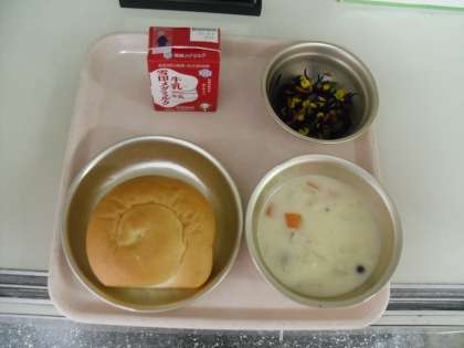 今日の献立は,牛乳・ひじきのソテー・バターうずまきパン・きのこのクリームシチューでした。