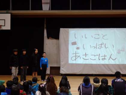 本日,2校時に生活向上の取組で5年生児童が全校のみんなに「朝ごはんの大切さ」について,発表しました。