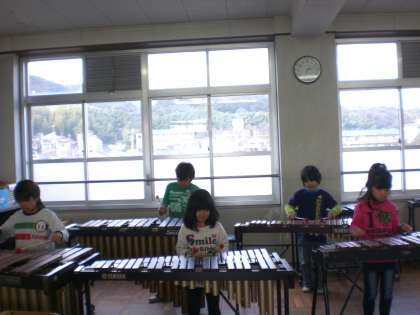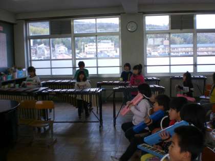 汽車が走る時の「ガッタンゴットン」という音や感じを,木琴の「ファ」と「ド」の音を使って表し,けんばんハーモニカのメロディーと合わせて合奏してみました。