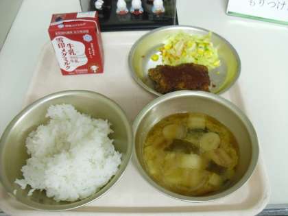今日の献立はごはん・牛乳・トンカツ・野菜のソテー・みそ汁です。
