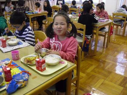 ランチルームの1年生も「1年生のランチルームは最後か〜。トンカツおいしいな〜。」「コーンが甘いよ」と言いながら食べていました。