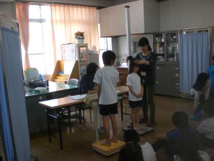 身体計測がありました。保健の先生のお話をよく聞いて身体計測を受けていました。