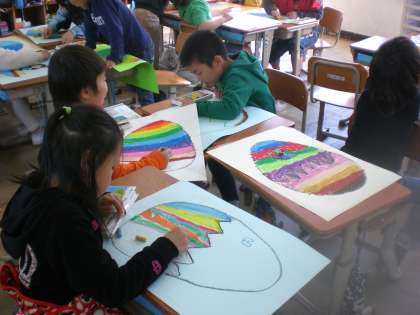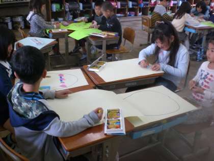 「ひみつのたまご」自分たちが描いたたまごから何が飛び出てくるのか,担任の先生のお手本を見ながら,子ども達は集中して学習にのぞんでいました。