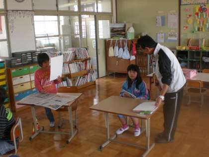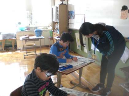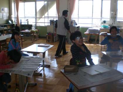 テレビの大きな画面に映し出されている,楽しく遊んでいるときの表情を真剣にながめ,しっかり画用紙に描いていました。