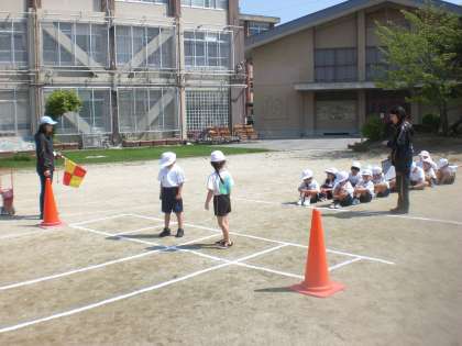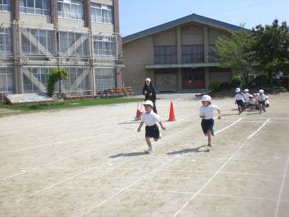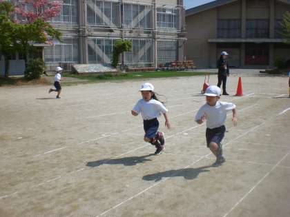 「よーい,ピ」という合図で走ります。最後まで一生懸命に走ること等を教えてもらいました。