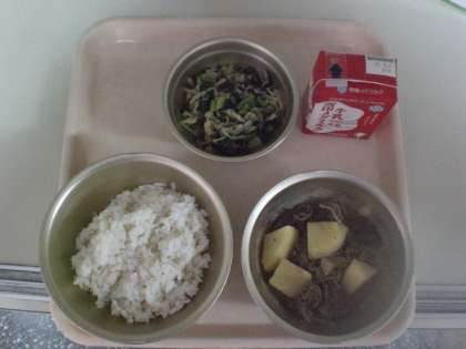 今日の献立は,こまつなと切り干し大根のにびたし・牛乳・むぎご飯・肉じゃがでした。