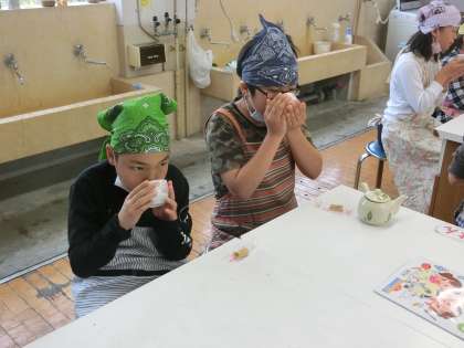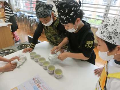 5年生から始まった家庭科の学習で,初めての調理実習を行いました。今回の調理実習では,ガスこんろを正しく使ってお湯をわかし,茶葉を急須にいれ,湯のみ茶わんに量や濃さが同じになるようにいれました。1人1人が安全に気をつけ,グループで協力しながら初めての調理実習を無事終えることができました。