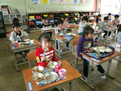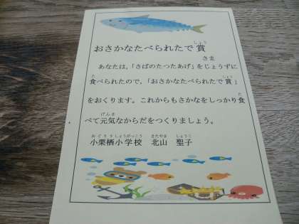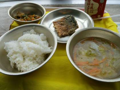 今日の給食は胚芽米ごはん・牛乳・さばのたつたあげ・野菜のきんぴら・キャベツの吉野汁でした。1年生にとっては初めての大きな魚です。「骨がいやだ〜。」「魚きらい」と言っていた子も,『おさかな食べたで賞』をめざしてがんばって食べました。なんと!全員が食べ終わったのですよ。たくましさくがんばって食べきろうとする姿に感激しました。