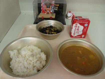 今日の献立は麦ごはん・牛乳・チキンカレー・ひじきのソテーです。